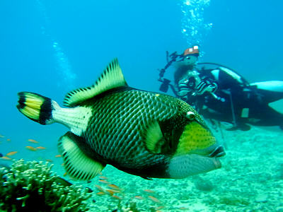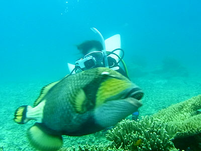ゴマモンガラに愛ちゃんも寄る寄る。。。 海のギャング:通常ダイバーは逃げます・・・笑 |