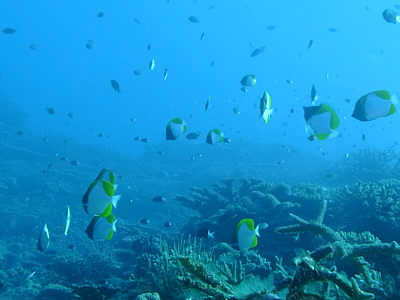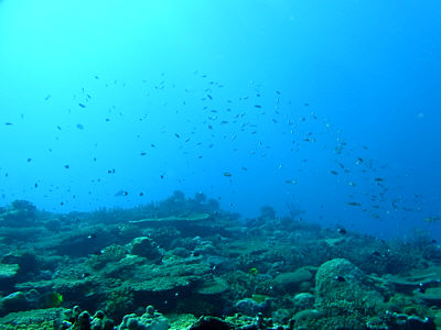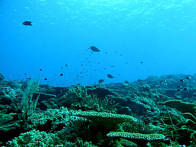 | 3日目の3本目(合計8本目!) クレナイステージ 写真でも分かるように テーブル珊瑚の群生〜〜〜 一面の珊瑚でマジきれいっす!!!!! ずっと着底せずに泳ぐのは苦手・・・笑 この日は,流れもあって大変でした・・・>。< |