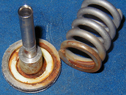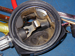 | 右の写真をご覧下さい。2年間O/Hしなかった為に、ファーストステージ内部、 セカンドステージ内部がこんなにも・・・・。ダイビングを楽しんで行く為には欠かせないダイビング器材ですが、海で 使った後はどのようなお手入れをしていますか?皆さんは真水でよく洗い、陰干しをして保管していると思います。しかし、奥 まできちんと洗えてる器材はほとんど無いって知ってました?使えば使うほど、そこには塩や汚れが溜まってしまい、動かなくなってしまう 場合や、可動している0リングやパッキン等の変形がおきたり、また、それらがヒビ割れるとエア 漏れの原因となります。そこでそれらを防ぐために器材のオーバーホールが必要となるわけです。 | ![]() ![]() |
