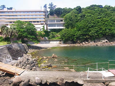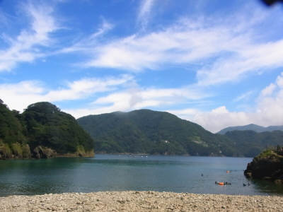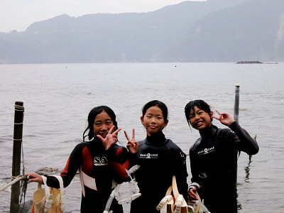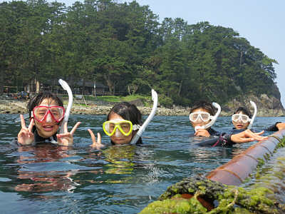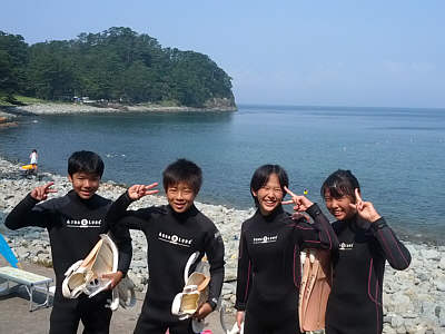 | 黄金崎の沖まで泳ぎました | 楽しんだかな〜 | 黄金崎海岸をバックにみんなでピース! |